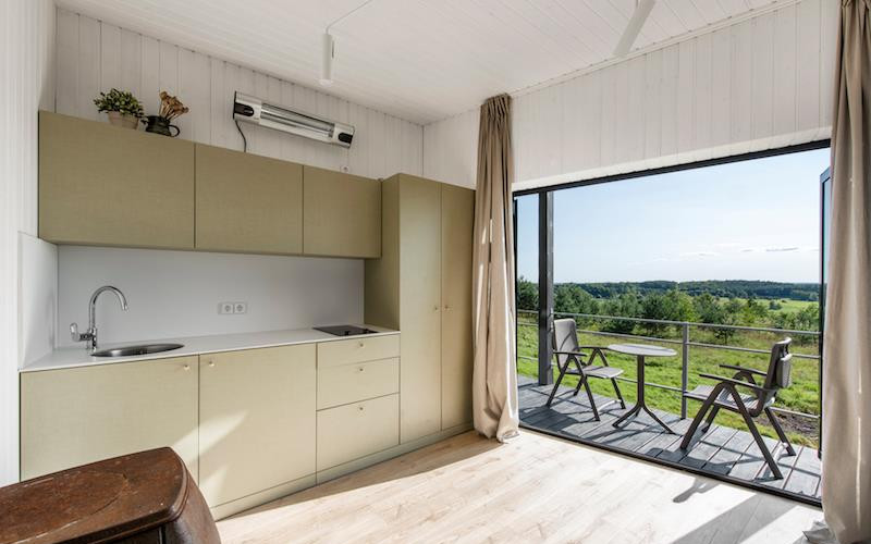 14 kv.m. plote yra viskas ko reikia trumpam pabėgimui iš miesto. Patogi virtuvės zona, dvigulė lova, spinta, san. mazgas, o centre – išskirtinio dizaino krosnelė. Pats namelis iš vienos pusės apgaubtas miško, o iš kitos pro vitrininį langą atsiveria nuostabi panorama. Tinkamai išrinkta vieta sukuria saugumo ir ramybės jausmą.