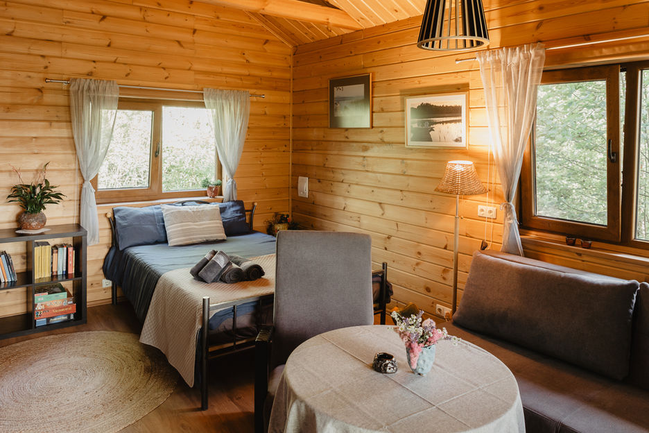 25 kv. m. Namelyje įrengta dvigulė lova, poilsio, virtuvėlės zona, yra atskira dušo ir wc patalpa. Šaltesniais vakarais jaukumo ir šilumos suteiks malkinė krosnelė. Jei apsistoti nori daugiau nei du svečiai, yra patogi sofa, bei antresolė su čiužiniu, tad namelyje gali apsistoti iki 6 svečių.