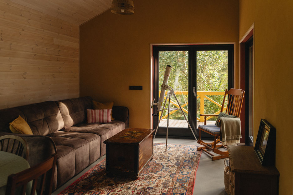 Geltonasis namelis - tai poilsio namelis laukiniuose Dzūkijos miškuose, kur susipina lietuviškas jaukumas ir skandinaviška dvasia. Čia modernūs elementai dera su autentiškomis antikvarinėmis detalėmis kurdami neįprastą, bet labai gražių vientisą paveikslą. Dideli mediniai langai leidžia mėgautis įspūdingais miško peizažais ir sustiprina gamtos artumo pojūtį. Namelyje pamatysite daug jaukių detalių ir tikimės pajusite kiek meilės ir darbo šeimininkai įdėjo savo rankomis kurdami šį namelį. Čia jų rankomis natūraliu molio tinku padengtos sienos, sumeistrauti baldai ir net grindys išlietos!